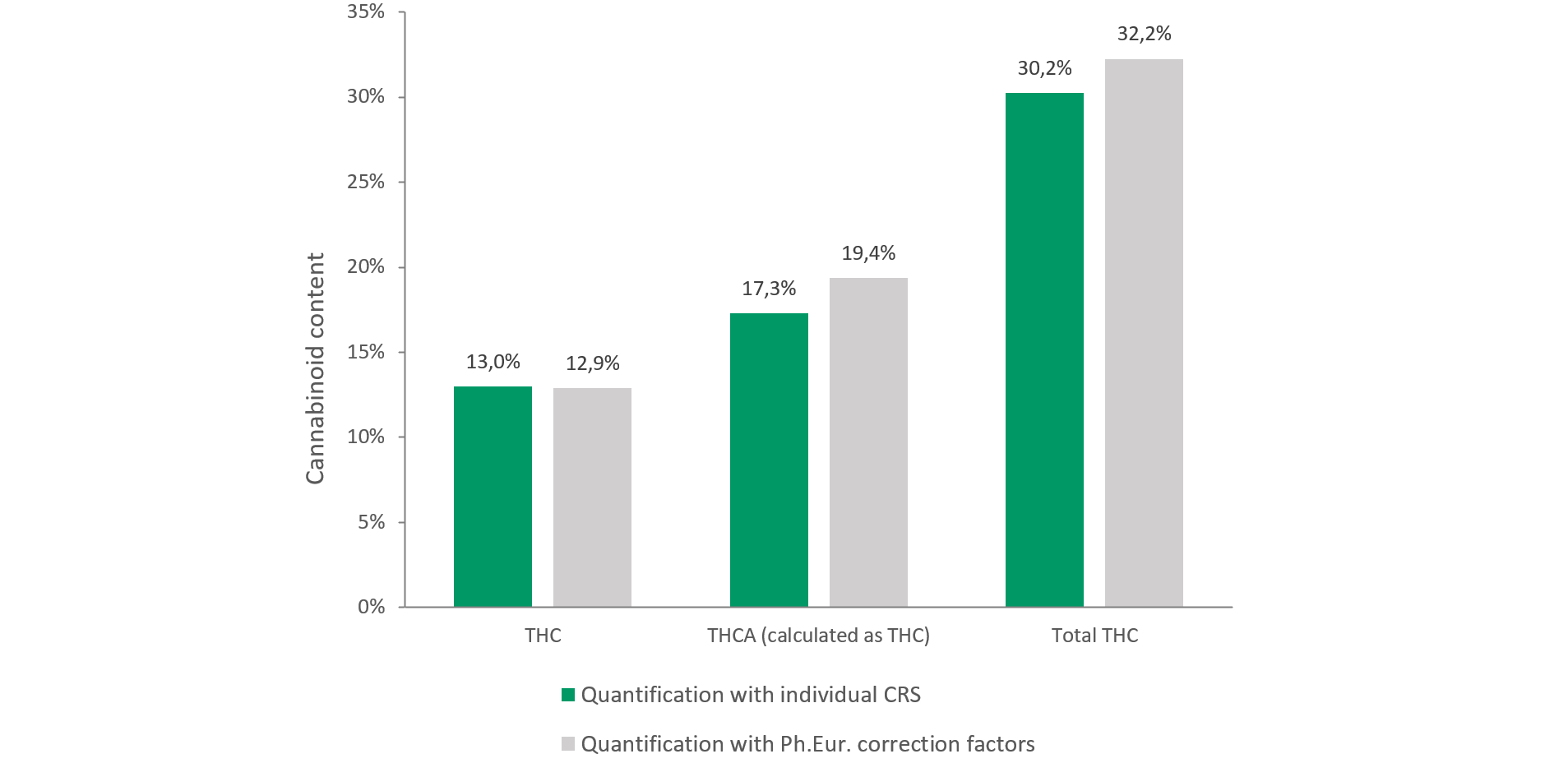 These deviations, particularly for acidic cannabinoids such as THCA, CBDA, and CBNA, have a direct impact on the reported total cannabinoid content. In a comparative assessment using identical chromatographic data from a 28/1 cannabis variety, quantification based on the unverified Ph. Eur. correction factors produced higher results than quantification based on individual certified reference standards (see Figure 1). This demonstrates that THCA, and consequently total THC, can be overestimated when fixed correction factors are applied without laboratory-specific verification. In practical terms, this creates a real risk that products which are analytically compliant may appear to fall outside the permitted specification range.