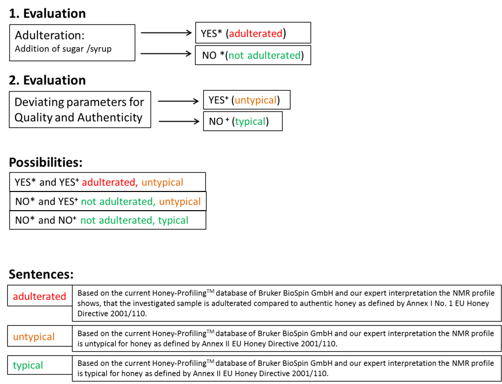 The current system declares a honey into typical (as defined by the Annex I and II EU Honey Directive 2001/110 and based on the current Honey-ProfilingTM database of Bruker BioSpin GmbH and our expert interpretation) if no deviations in the parameters and the entire NMR profile (fingerprint of the honey) can be observed. An untypical honey according to the Annex I and II EU Honey Directive 2001/110 shows indications of adulteration in the NMR profile mainly in the sugar area or also in deviating quality parameters, like a higher HMF concentration above the thresholds of 40 mg/kg and 80 mg/kg (topical origin).