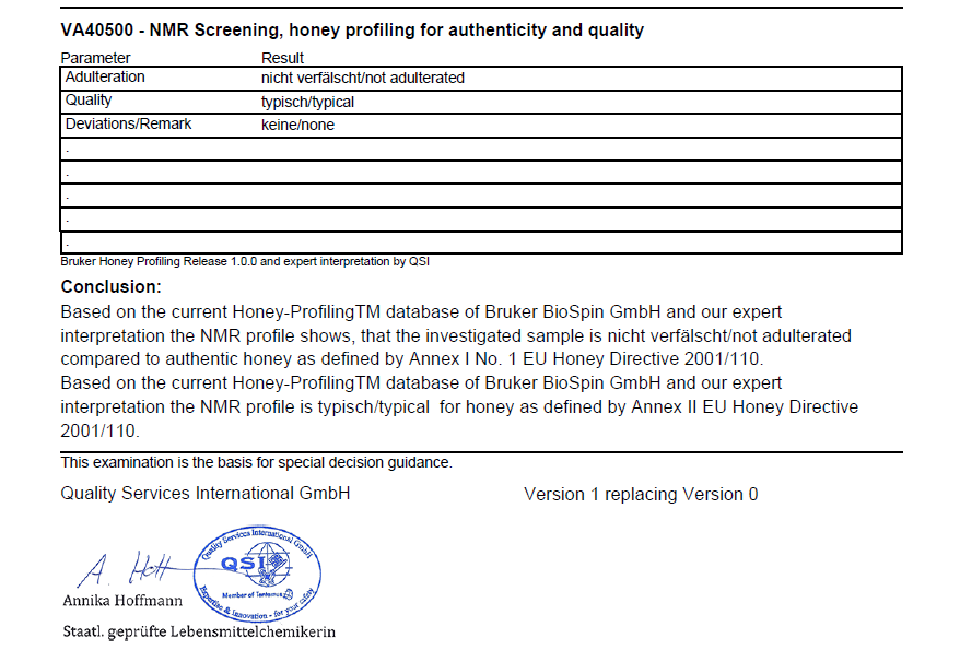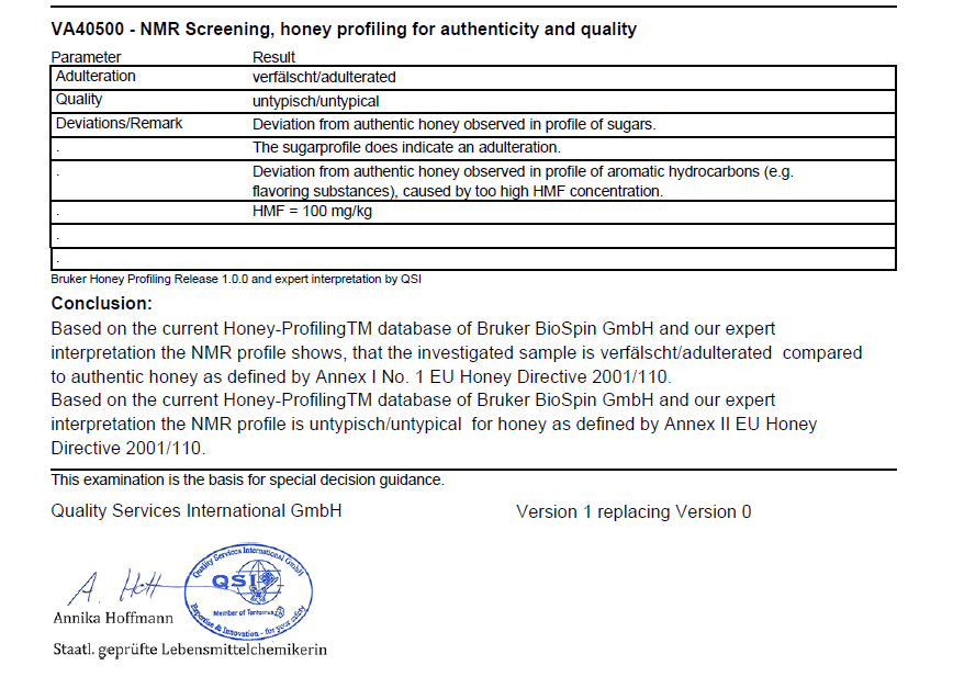 If the honey shows no sign of adulteration or quality issues the honey will be declared as not adulterated and typical (figure 4). The authenticity concerning the botanical or geographical origin of such evaluated honey can sometimes not be confirmed. For example a Romanian sunflower honey looks rather like a polyfloral honey (containing a lot of sunflower) and comes from Bulgaria instead. This honey remains still as not adulterated and typical and an additional remark about the origin would be written.